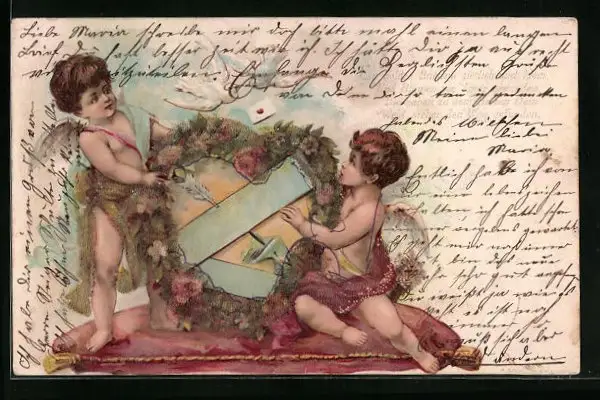AK Amor hält Herz aus Blumen, Zwei Tauben mit Kuvert