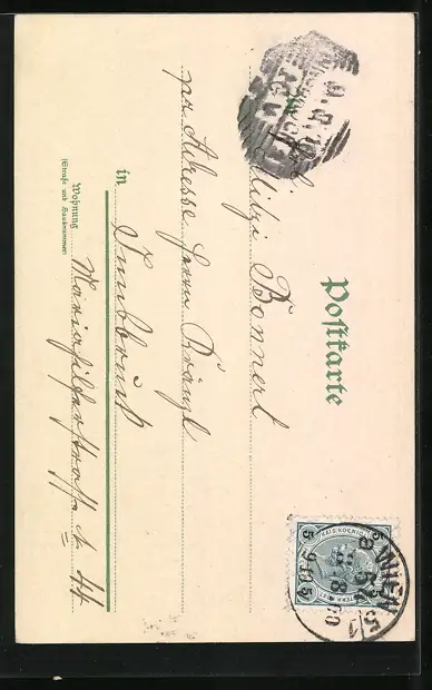 Personenbezogene Daten auf der Rückseite der Karte wurden durch blauen Textmarker unkenntlich gemacht. Die blauen Stellen sind auf die Vorderseite durchgeweicht und wirken sich negativ auf das Postkartenfoto aus