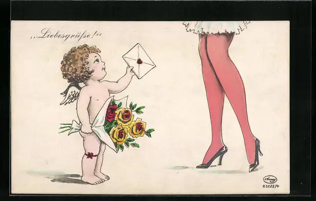 AK Amor mit Liebesbrief und schöne Damenbeine
