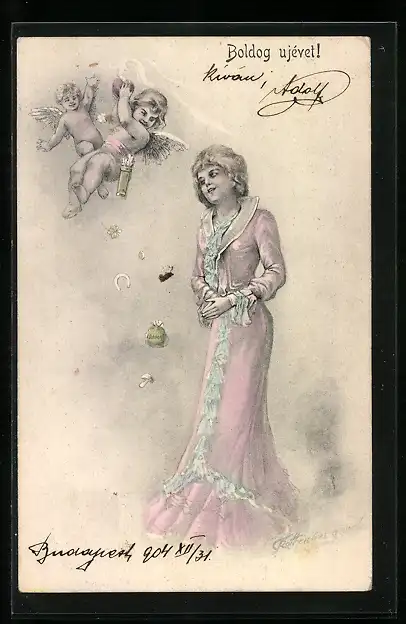 AK Amor schwebt mit Herz über einer Frau