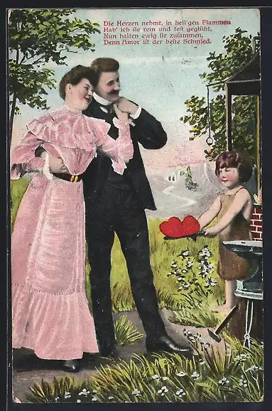 AK Amor übergibt einem Liebespaar ein Paar Herzen