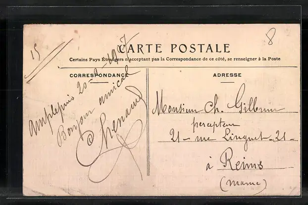 Personenbezogene Daten auf der Rückseite der Karte wurden durch blauen Textmarker unkenntlich gemacht. Die blauen Stellen sind auf die Vorderseite durchgeweicht und wirken sich negativ auf das Postkartenfoto aus