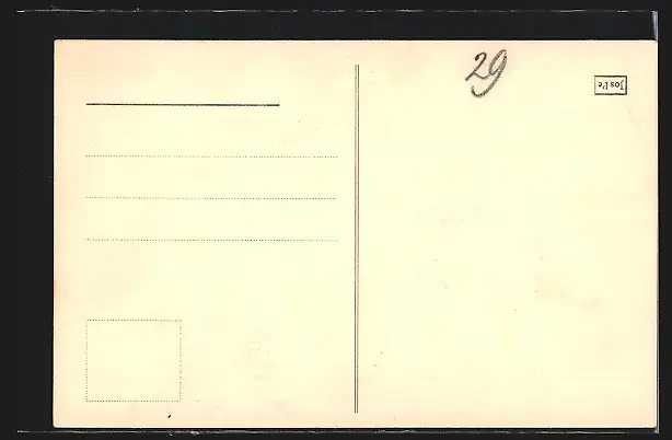 Personenbezogene Daten auf der Rückseite der Karte wurden durch blauen Textmarker unkenntlich gemacht. Die blauen Stellen sind auf die Vorderseite durchgeweicht und wirken sich negativ auf das Postkartenfoto aus
