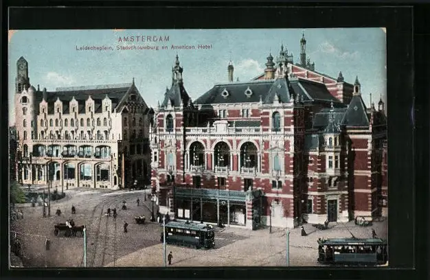 AK Amsterdam, Leidscheplan, Stadschouwburg en American Hotel, Strassenbahn