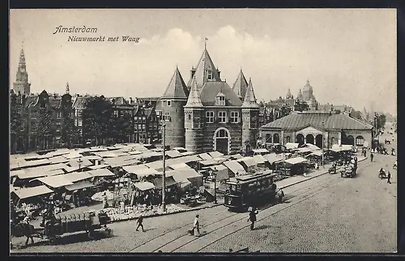 AK Amsterdam, Nieuwmarkt met Waag, Strassenbahn
