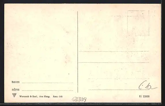 Personenbezogene Daten auf der Rückseite der Karte wurden durch blauen Textmarker unkenntlich gemacht. Die blauen Stellen sind auf die Vorderseite durchgeweicht und wirken sich negativ auf das Postkartenfoto aus