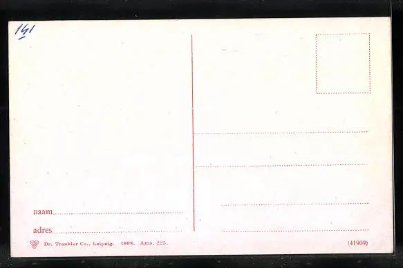 Personenbezogene Daten auf der Rückseite der Karte wurden durch blauen Textmarker unkenntlich gemacht. Die blauen Stellen sind auf die Vorderseite durchgeweicht und wirken sich negativ auf das Postkartenfoto aus