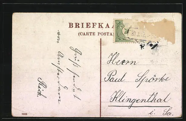 alte Ansichtskarte, gelaufen, Briefmarke entfernt, rückseitig Oberflächenschaden, Stempelspur, Eckknick re. unten, guter Zustand