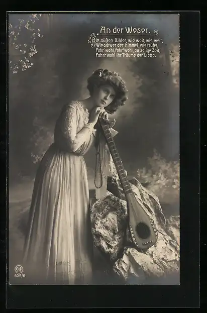AK An der Weser, Die süssen Bilder, wie weit..., Junge Frau mit Lautengitarre