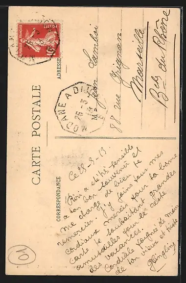 Personenbezogene Daten auf der Rückseite der Karte wurden durch blauen Textmarker unkenntlich gemacht. Die blauen Stellen sind auf die Vorderseite durchgeweicht und wirken sich negativ auf das Postkartenfoto aus