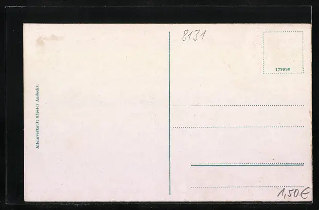 Personenbezogene Daten auf der Rückseite der Karte wurden durch blauen Textmarker unkenntlich gemacht. Die blauen Stellen sind auf die Vorderseite durchgeweicht und wirken sich negativ auf das Postkartenfoto aus