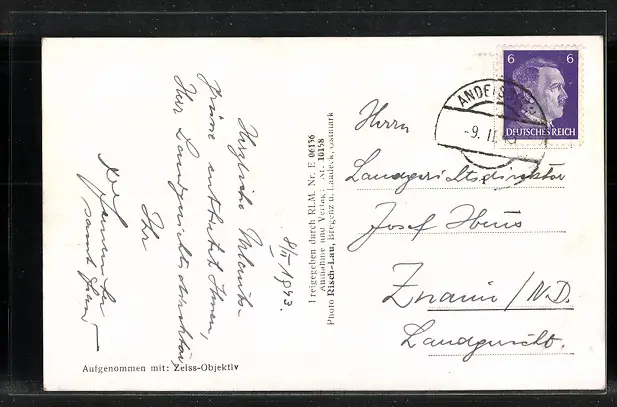 Personenbezogene Daten auf der Rückseite der Karte wurden durch blauen Textmarker unkenntlich gemacht. Die blauen Stellen sind auf die Vorderseite durchgeweicht und wirken sich negativ auf das Postkartenfoto aus