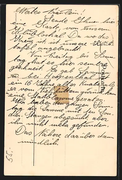 Personenbezogene Daten auf der Rückseite der Karte wurden durch blauen Textmarker unkenntlich gemacht. Die blauen Stellen sind auf die Vorderseite durchgeweicht und wirken sich negativ auf das Postkartenfoto aus