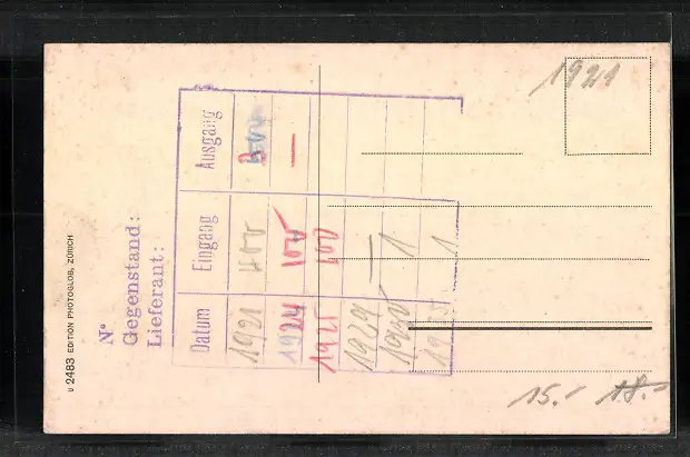 Personenbezogene Daten auf der Rückseite der Karte wurden durch blauen Textmarker unkenntlich gemacht. Die blauen Stellen sind auf die Vorderseite durchgeweicht und wirken sich negativ auf das Postkartenfoto aus