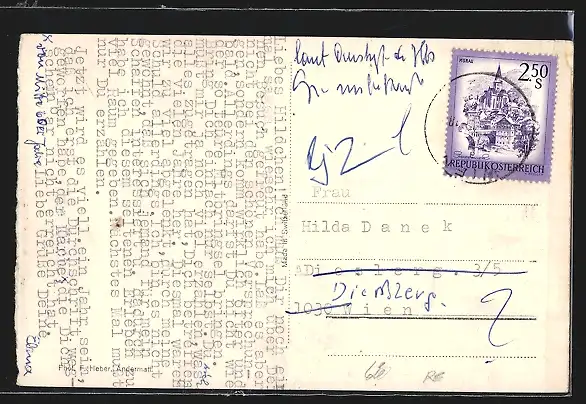 Personenbezogene Daten auf der Rückseite der Karte wurden durch blauen Textmarker unkenntlich gemacht. Die blauen Stellen sind auf die Vorderseite durchgeweicht und wirken sich negativ auf das Postkartenfoto aus