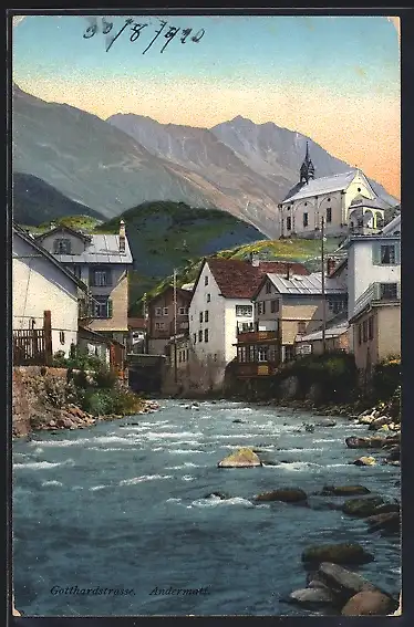 AK Andermatt, Ortspartie mit Kirche und Fluss