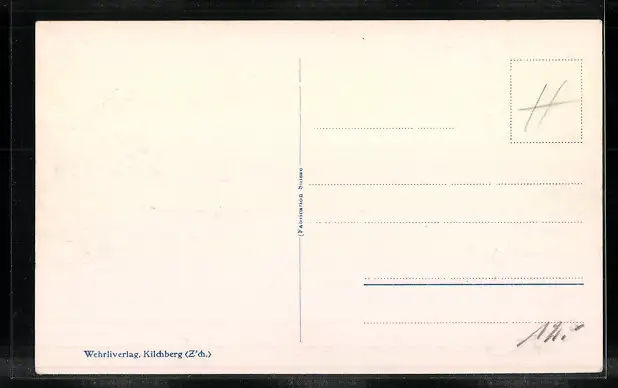 Personenbezogene Daten auf der Rückseite der Karte wurden durch blauen Textmarker unkenntlich gemacht. Die blauen Stellen sind auf die Vorderseite durchgeweicht und wirken sich negativ auf das Postkartenfoto aus
