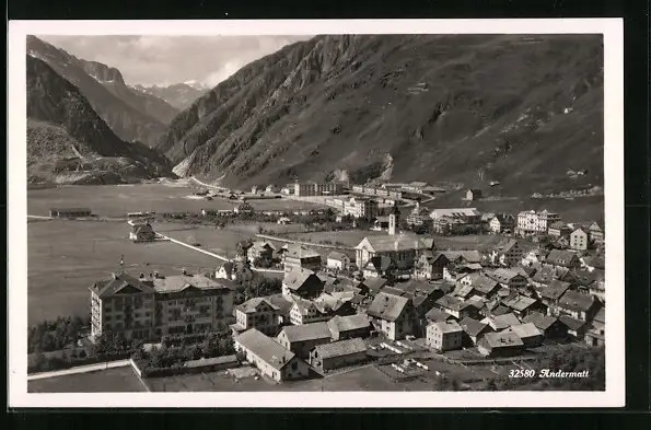 AK Andermatt, Teilansicht mit Feldern aus der Vogelschau