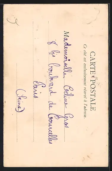 Personenbezogene Daten auf der Rückseite der Karte wurden durch blauen Textmarker unkenntlich gemacht. Die blauen Stellen sind auf die Vorderseite durchgeweicht und wirken sich negativ auf das Postkartenfoto aus