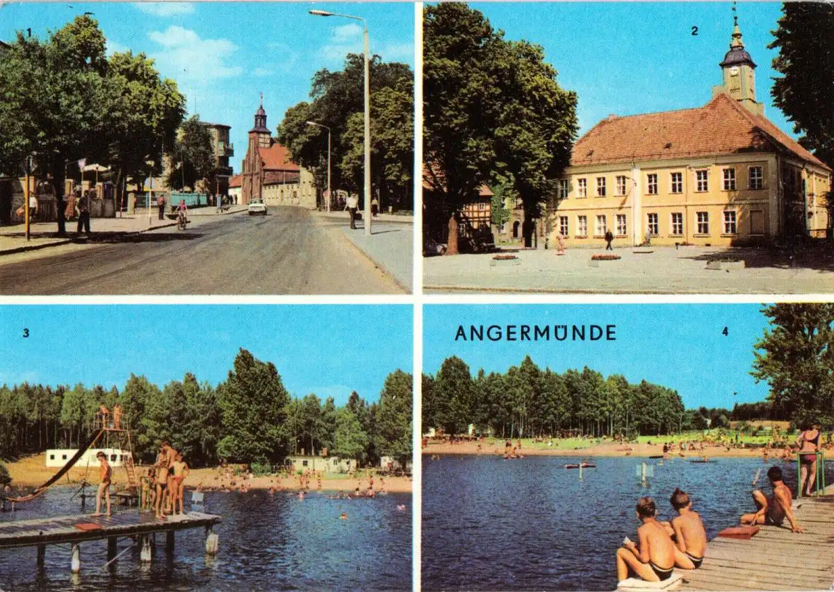 AnsichtskarteAngermündevier Abb. - Berliner Str., Rathaus, Freibad Wolletzsee (2)