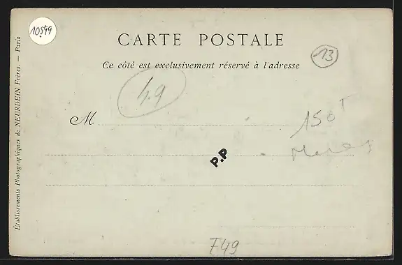 Personenbezogene Daten auf der Rückseite der Karte wurden durch blauen Textmarker unkenntlich gemacht. Die blauen Stellen sind auf die Vorderseite durchgeweicht und wirken sich negativ auf das Postkartenfoto aus