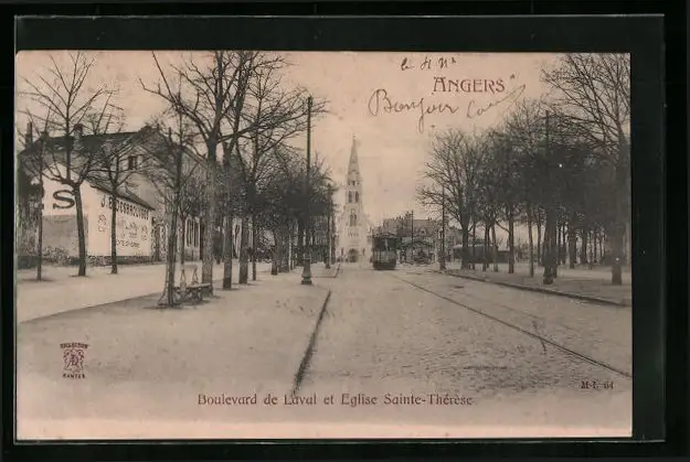 AK Angers, Boulevard de Llaval et Eglise Sainte-Thérèse, Strassenbahn
