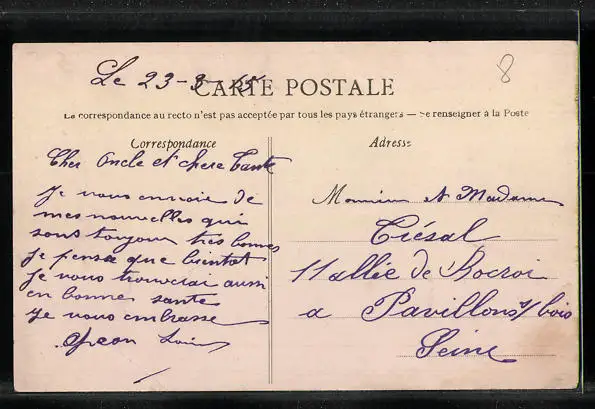 Personenbezogene Daten auf der Rückseite der Karte wurden durch blauen Textmarker unkenntlich gemacht. Die blauen Stellen sind auf die Vorderseite durchgeweicht und wirken sich negativ auf das Postkartenfoto aus