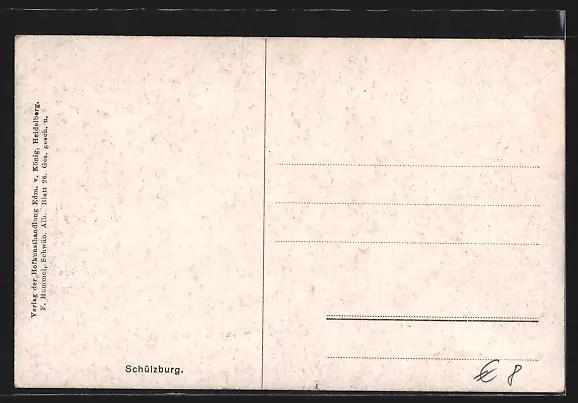 Personenbezogene Daten auf der Rückseite der Karte wurden durch blauen Textmarker unkenntlich gemacht. Die blauen Stellen sind auf die Vorderseite durchgeweicht und wirken sich negativ auf das Postkartenfoto aus