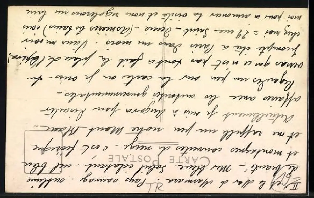 Personenbezogene Daten auf der Rückseite der Karte wurden durch blauen Textmarker unkenntlich gemacht. Die blauen Stellen sind auf die Vorderseite durchgeweicht und wirken sich negativ auf das Postkartenfoto aus