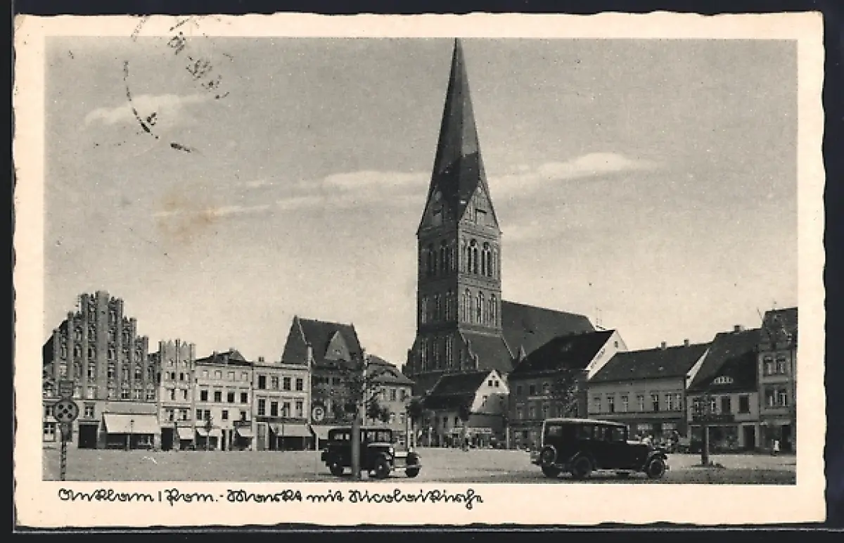 AK Anklam /Pom., Markt mit Nicolaikirche und Geschäften
