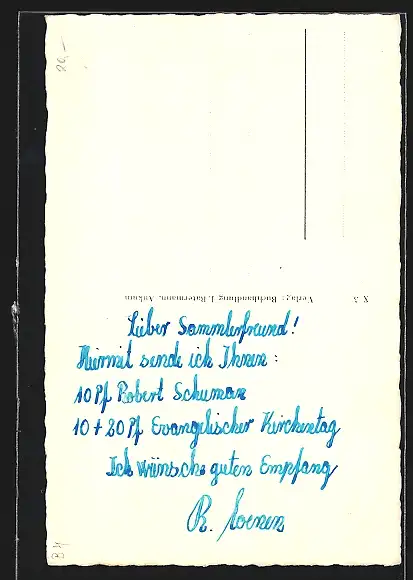 Personenbezogene Daten auf der Rückseite der Karte wurden durch blauen Textmarker unkenntlich gemacht. Die blauen Stellen sind auf die Vorderseite durchgeweicht und wirken sich negativ auf das Postkartenfoto aus