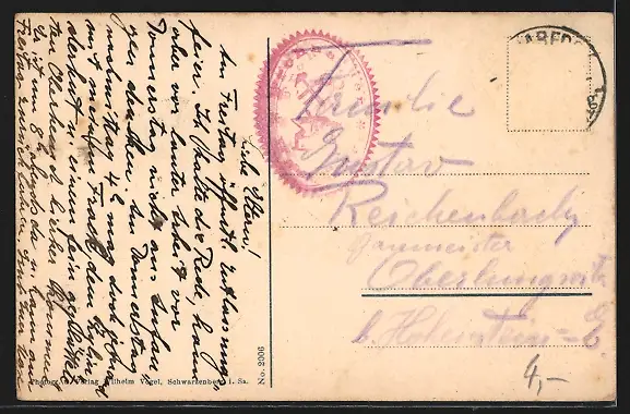 Personenbezogene Daten auf der Rückseite der Karte wurden durch blauen Textmarker unkenntlich gemacht. Die blauen Stellen sind auf die Vorderseite durchgeweicht und wirken sich negativ auf das Postkartenfoto aus