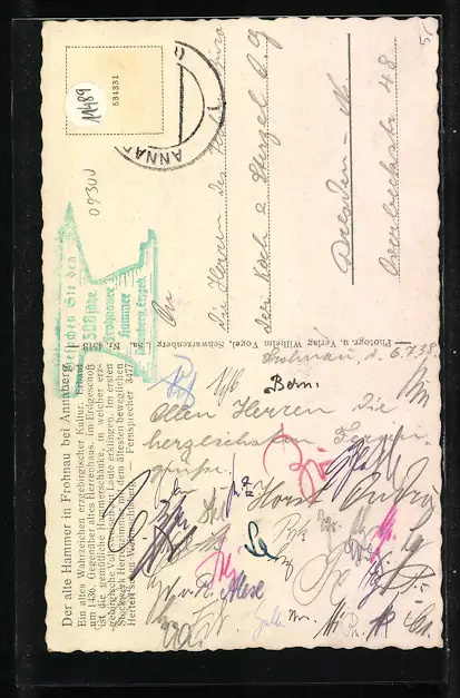 Personenbezogene Daten auf der Rückseite der Karte wurden durch blauen Textmarker unkenntlich gemacht. Die blauen Stellen sind auf die Vorderseite durchgeweicht und wirken sich negativ auf das Postkartenfoto aus