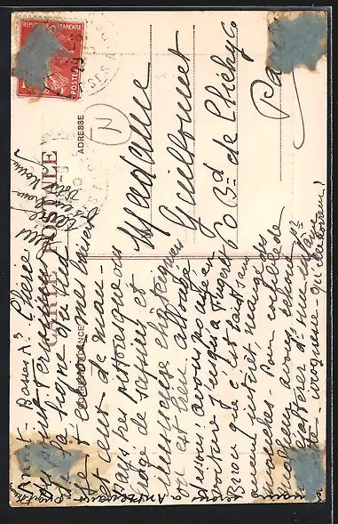 Personenbezogene Daten auf der Rückseite der Karte wurden durch blauen Textmarker unkenntlich gemacht. Die blauen Stellen sind auf die Vorderseite durchgeweicht und wirken sich negativ auf das Postkartenfoto aus