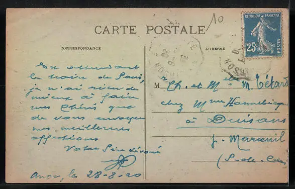 Personenbezogene Daten auf der Rückseite der Karte wurden durch blauen Textmarker unkenntlich gemacht. Die blauen Stellen sind auf die Vorderseite durchgeweicht und wirken sich negativ auf das Postkartenfoto aus