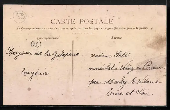 Personenbezogene Daten auf der Rückseite der Karte wurden durch blauen Textmarker unkenntlich gemacht. Die blauen Stellen sind auf die Vorderseite durchgeweicht und wirken sich negativ auf das Postkartenfoto aus