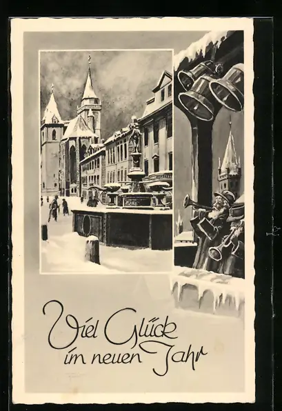 AK Ansbach, Brunnen und Kirche im Winter, Turmbläser, Neujahrsgruss