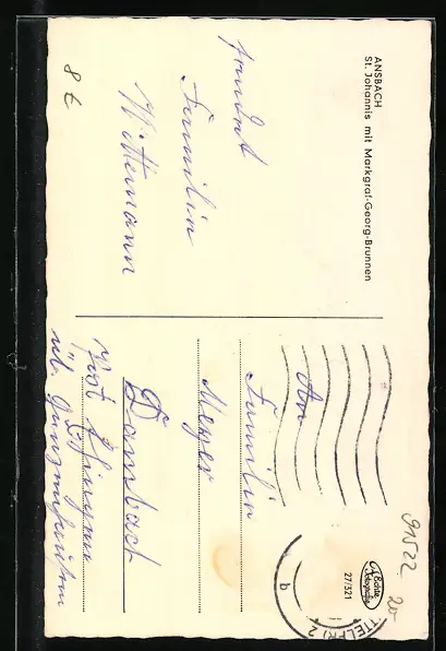 Personenbezogene Daten auf der Rückseite der Karte wurden durch blauen Textmarker unkenntlich gemacht. Die blauen Stellen sind auf die Vorderseite durchgeweicht und wirken sich negativ auf das Postkartenfoto aus