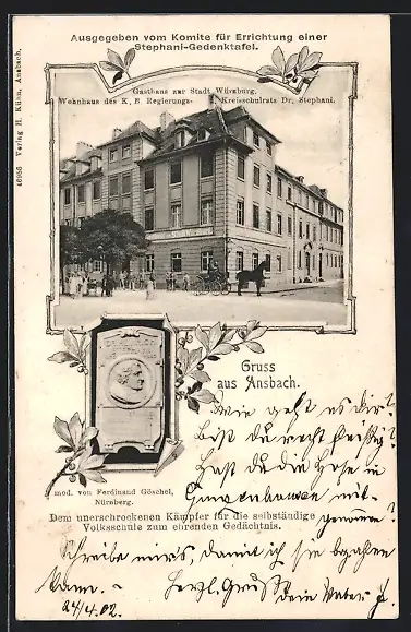 AK Ansbach, Gasthaus zur Stadt Würzburg, Errichtung einer Stephani-Gedenktafel