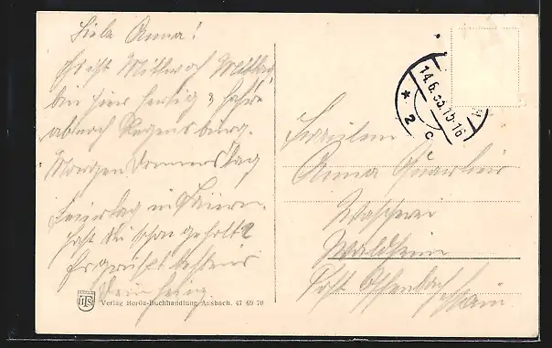 Personenbezogene Daten auf der Rückseite der Karte wurden durch blauen Textmarker unkenntlich gemacht. Die blauen Stellen sind auf die Vorderseite durchgeweicht und wirken sich negativ auf das Postkartenfoto aus