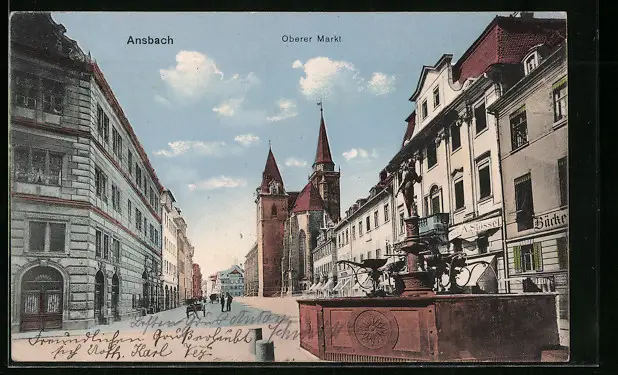 AK Ansbach, Oberer Markt mit Geschäften und Brunnen