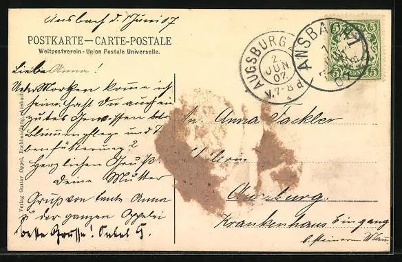 alte Ansichtskarte, gelaufen 1907, rückseitig Klebe- und Papierreste, guter Zustand