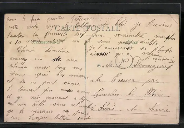 Personenbezogene Daten auf der Rückseite der Karte wurden durch blauen Textmarker unkenntlich gemacht. Die blauen Stellen sind auf die Vorderseite durchgeweicht und wirken sich negativ auf das Postkartenfoto aus