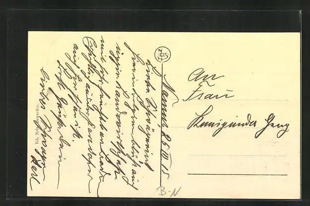 Personenbezogene Daten auf der Rückseite der Karte wurden durch blauen Textmarker unkenntlich gemacht. Die blauen Stellen sind auf die Vorderseite durchgeweicht und wirken sich negativ auf das Postkartenfoto aus
