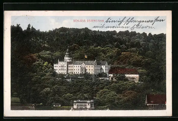 Personenbezogene Daten auf der Rückseite der Karte wurden durch blauen Textmarker unkenntlich gemacht. Die blauen Stellen sind auf die Vorderseite durchgeweicht und wirken sich negativ auf das Postkartenfoto aus