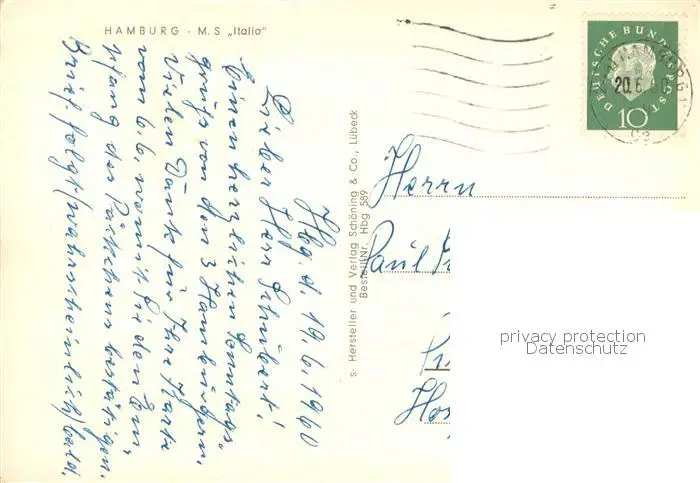 73819453 Dampfer_Oceanliner Hamburg MS ITALIO postalisch gelaufen 1960 Erhaltung siehe scans [IrynaD87] [Iryn PID ]