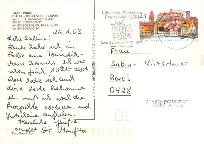 73837038 Podebrady_Bad_Podiebrad_CZ Hotel Bellevue Tlapak postalisch gelaufen 2003 Erhaltung siehe scans [FriedD77] [Frierer ]