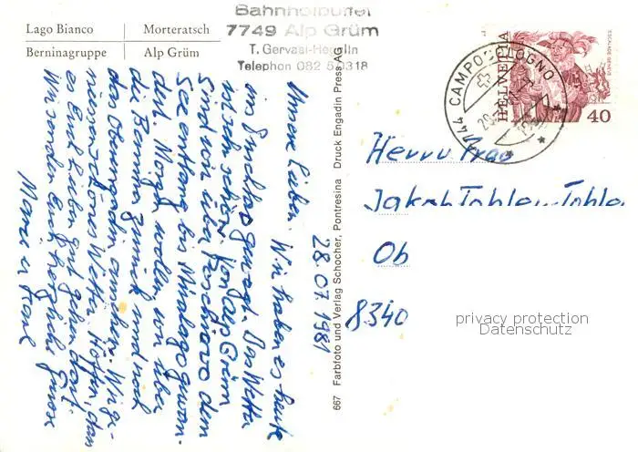 73841972 Bergbahn Berninabahn Bergbahn postalisch gelaufen 1981 Erhaltung siehe scans [IrynaD87] [Iryn PID ]