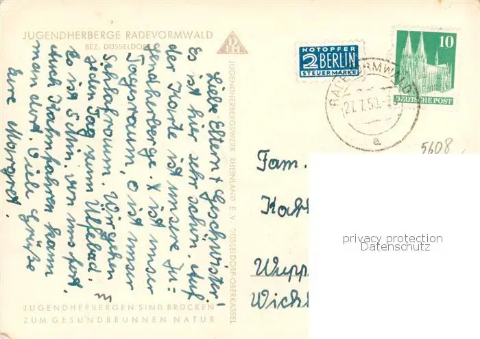 73852733 Radevormwald Jugendherberge Radevormwald postalisch gelaufen 1950 Erhaltung siehe scans [FriedD77] [Frierer ]