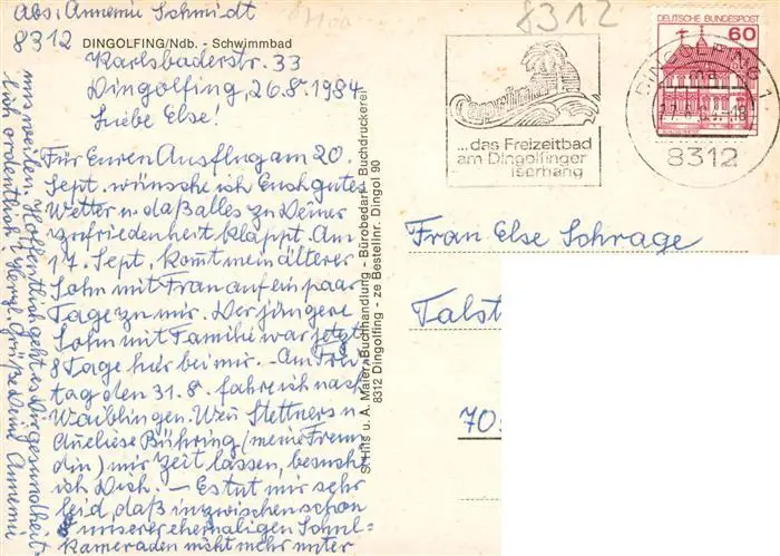 73890983 Dingolfing Schwimmbad Dingolfing postalisch gelaufen 1984 Erhaltung siehe scans [FriedD77] [Frierer ]